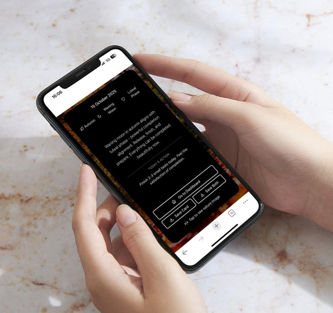 I looked into natural cycles, the moon, my hormonal rhythm, and even the Chinese body clock. Each piece gave insight — but they all lived on separate platforms.I wanted one place that brings it all together.